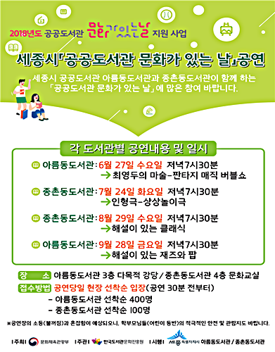 ¼¼Á¾½Ã ¾Æ¸§µ¿µµ¼°ü°ú Á¾Ã̵¿µµ¼°üÀÌ ¡®2018³â °ø°øµµ¼°ü ¹®È°¡ ÀÖ´Â ³¯¡¯Çà»ç·Î ÀÌ´ÞºÎÅÍ 9¿ù±îÁö ¸¶¼ú, ÀÎÇü±Ø, Ŭ·¡½Ä µî ´Ù¾çÇÑ ¹®È°ø¿¬À» ÆîÄ£´Ù.