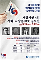¼¼Á¾½Ã±³À°Ã»Àº 3¡¤1¿îµ¿°ú ÀÓ½ÃÁ¤ºÎ ¼ö¸³ 100ÁÖ³âÀ» ¸Â¾Æ ¡¸ÀúÇ×½ÃÀÎ 4ÀÎ ½ÃÈ¡¤½Ã³¶¼Û UCC °ø¸ðÀü¡¹À» °³ÃÖÇÑ´Ù°í ¹àÇû´Ù.¿À´Â 13ÀϺÎÅÍ 22ÀϱîÁö ÁøÇàµÇ...