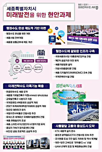 ºÐ¾ßº°·Î ¡®´ëÇѹα¹ ÇàÁ¤¼öµµ ¼¼Á¾ ¿Ï¼ºÀ» À§ÇÑ Á¦µµÀû ±â¹Ý ¸¶·Ã¡¯ 3°Ç, ¡®ÇàÁ¤¼öµµ ¼¼Á¾¿¡ °É¸ÂÀº ÀÎÇÁ¶ó ±¸Ã࡯ ºÐ¾ß 6°Ç, ¡®¹®È­¡¤°ü±¤ ¹× ½Å»ê¾÷ À°¼ºÀ» ÅëÇÑ ÀÚÁ·±â´É È®Ãæ¡¯ ºÐ¾ß 12°Ç, ¡®»çÅë¹ß´Þ ´ëÇѹα¹ ±³ÅëÀÇ Á߽ɵµ½Ã µµ¾à¡¯ 5°ÇÀÌ´Ù.
