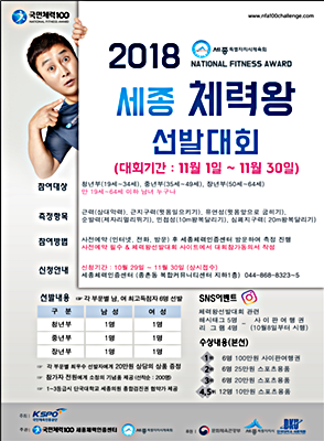 ¼¼Á¾ ü·Â¿Õ ¼±¹ß´ëȸ Âü°¡´Â ±¹¹Îü·Â100ȨÆäÀÌÁö(https://nfa100challenge.com), ¹æ¹® ¶Ç´Â ÀüÈ(044-868-8323~5)Á¢¼ö·Î »çÀü¿¹¾à ÈÄ ±â°£ ³»¿¡ ÁßÃ̵¿ º¹ÇÕÄ¿¹Â´ÏƼ¼¾ÅÍ ÁöÇÏ 1Ãþ¿¡ À§Ä¡ÇÑ ¼¼Á¾Ã¼·ÂÀÎÁõ¼¾ÅÍ¿¡¼ ü·ÂÃøÁ¤¿¡ Âü¿©ÇÏ¸é µÈ´Ù.